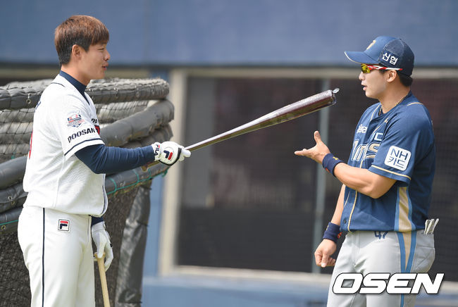 29일 오후 서울 잠실구장에서 열린 '2015 타이어뱅크 KBO 리그' 두산 베어스와 NC 다이노스의 경기에 앞서 두산 민병헌과 NC 나성범이 장난을 치며 이야기를 나누고 있다.