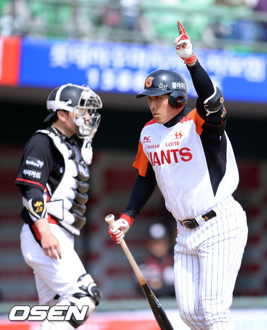 29일 오후 부산 사직구장서 열린 '2015 타이어뱅크 KBO 리그' 롯데 자이언츠와 kt위즈의 경기, 1회말 1사 롯데 황재균이 선취 홈런을 날리고 홈 베이스를 밟고 있다