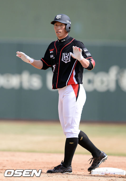 29일 오후 부산 사직구장서 열린 '2015 타이어뱅크 KBO 리그' 롯데 자이언츠와 kt위즈의 경기, 2회초 1사 1,3루 kt위즈 김사연이 동점 1타점 2루타를 날리고 2루에 세이프되고 있다.