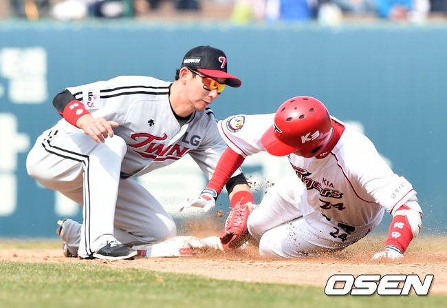 29일 오후 광주-KIA챔피언스필드에서 진행된 '2015 타이어뱅크 KBO 리그' KIA와 LG의 경기, 2회말 1사에서 KIA 김다원이 중전안타를 치고 2루까지 쇄도했지만 태그아웃 처리되고 있다.