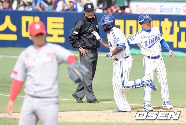 3회말 삼성 공격 1사 주자없는 상황 나바로가 좌중간 솔로포를 날리고 그라운드를 돌고 있다.