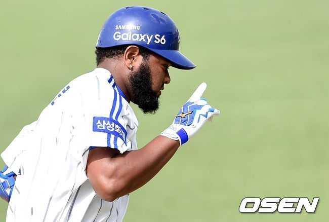 3회말 삼성 공격 1사 주자없는 상황 나바로가 좌중간 솔로포를 날리고 그라운드를 돌고 있다.
