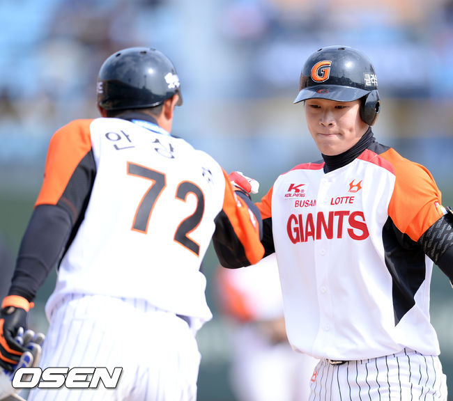 29일 오후 부산 사직구장서 열린 '2015 타이어뱅크 KBO 리그' 롯데 자이언츠와 kt위즈의 경기, 3회말 2사 만루 롯데 김민하가 역전 2타점 적시타를 날리고 안상준 1루 코치와 하이파이브를 하고 있다