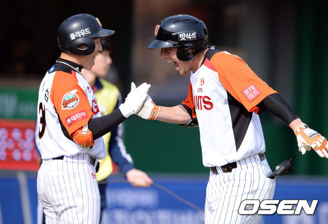 29일 오후 부산 사직구장서 열린 '2015 타이어뱅크 KBO 리그' 롯데 자이언츠와 kt위즈의 경기, 4회말 1사 롯데 아두치가 솔로홈런을 날리고 손아섭과 하이파이브를 하고 있다.