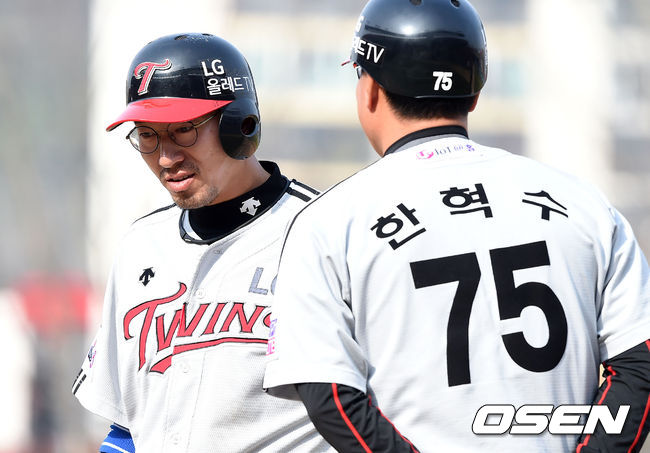 29일 오후 광주-KIA챔피언스필드에서 진행된 '2015 타이어뱅크 KBO 리그' KIA와 LG의 경기, 5회초 무사에서 LG 정성훈이 내야안타를 치고 한혁수 코치와 이야기를 나누고 있다.