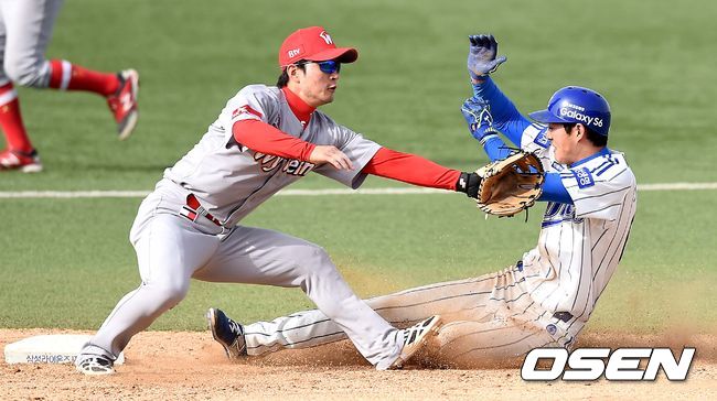 6회말 삼성 공격 1사 1루 상황 진갑용 타석 때 구자욱이 2루 도루에 성공하고 있다.