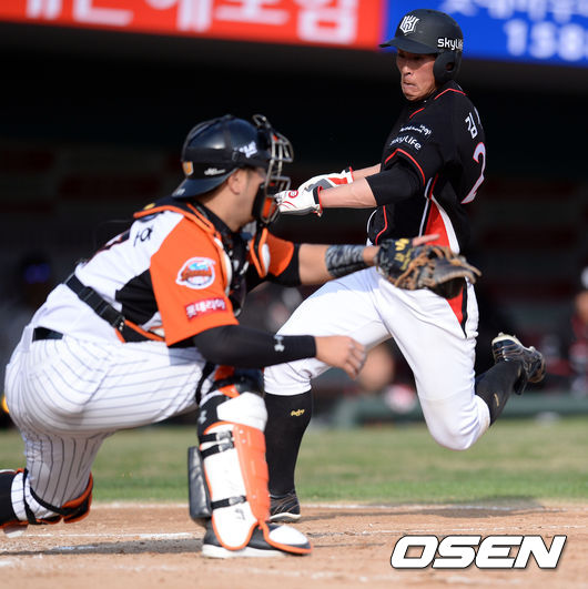 29일 오후 부산 사직구장서 열린 '2015 타이어뱅크 KBO 리그' 롯데 자이언츠와 kt위즈의 경기, 7회초 2사 2루 kt 김동명의 1타점 적시타때 2루 주자 김사연이 홈에 세이프되고 있다.
