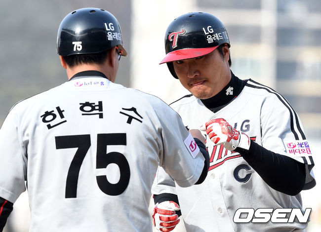 29일 오후 광주-KIA챔피언스필드에서 진행된 '2015 타이어뱅크 KBO 리그' KIA와 LG의 경기, 6회초 1사 2루에서 LG 이진영이 적시타를 치고 한혁수 코치와 하이파이브를 하고 있다.
