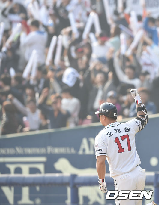 29일 오후 서울 잠실구장에서 열린 '2015 타이어뱅크 KBO 리그' 두산 베어스와 NC 다이노스의 경기,7회말 2사 2루 오재훤 투런 홈런을 날리며 환호하며 그라운드를 돌고 있다.