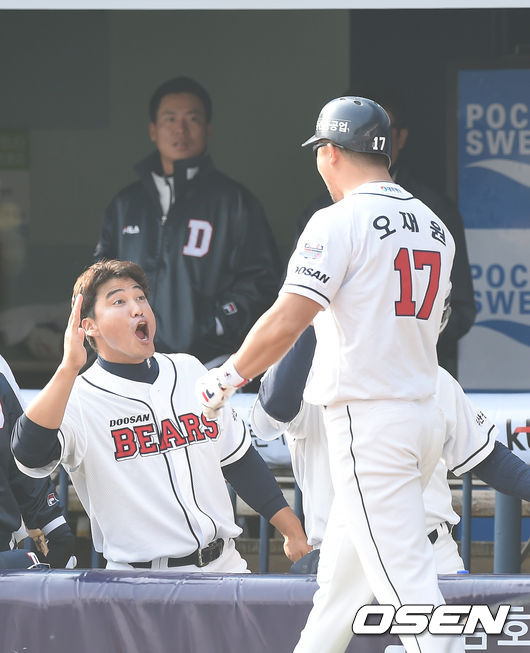 29일 오후 서울 잠실구장에서 열린 '2015 타이어뱅크 KBO 리그' 두산 베어스와 NC 다이노스의 경기,7회말 2사 2루 오재원 투런 홈런을 날리고 홈인 홍성흔의 축하를 받고 있다.