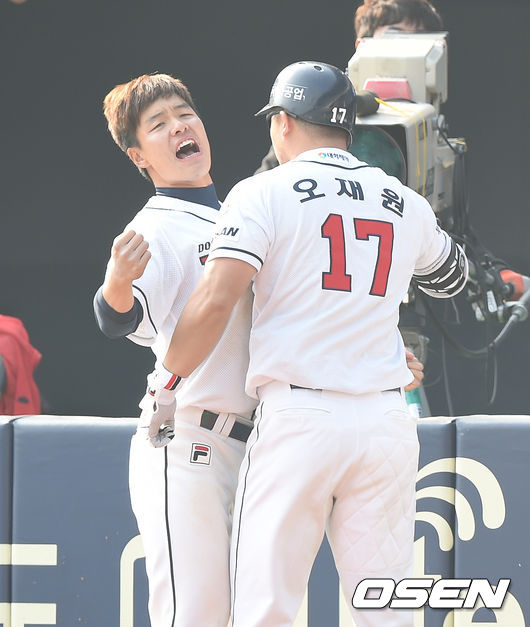 29일 오후 서울 잠실구장에서 열린 '2015 타이어뱅크 KBO 리그' 두산 베어스와 NC 다이노스의 경기,7회말 2사 2루 오재원 투런홈런을 날리고 홈인 민병헌의 환영을 받고 있다.