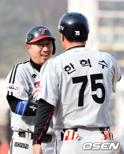 29일 오후 광주-KIA챔피언스필드에서 진행된 '2015 타이어뱅크 KBO 리그' KIA와 LG의 경기, 6회초 1사 2,3루에서 중전 2타점 적시타를 치고 한혁수 코치와 하이파이브를 하고 있다.