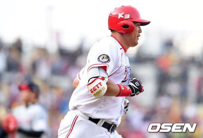 29일 오후 광주-KIA챔피언스필드에서 진행된 '2015 타이어뱅크 KBO 리그' KIA와 LG의 경기, 7회말 2사에서 KIA 최희섭이 우월 솔로 홈런을 치고 그라운드를 돌고 있다.