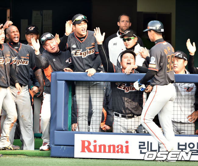 29일 목동구장에서 벌어진 '2015 타이어뱅크 KBO 리그' 넥센 히어로즈와 한화 이글스의 경기 한화 이글스 8회초 무사 1,3루 정범모의 병살성 타구가 2루 베이스 맞고 튀어 오르며 안타가 돼 홈을 밟은 송주호가 동료들의 환영을 받고 있다.