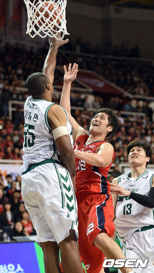 29일 오후 울산동천체육관서 열린 2014-2015 KCC 프로농구 챔피언결정전 1차전 울산 모비스와 원주 동부의 경기, 4쿼터 동부 사이먼이 모비스 함지훈의 슛을 블록하고 있다.