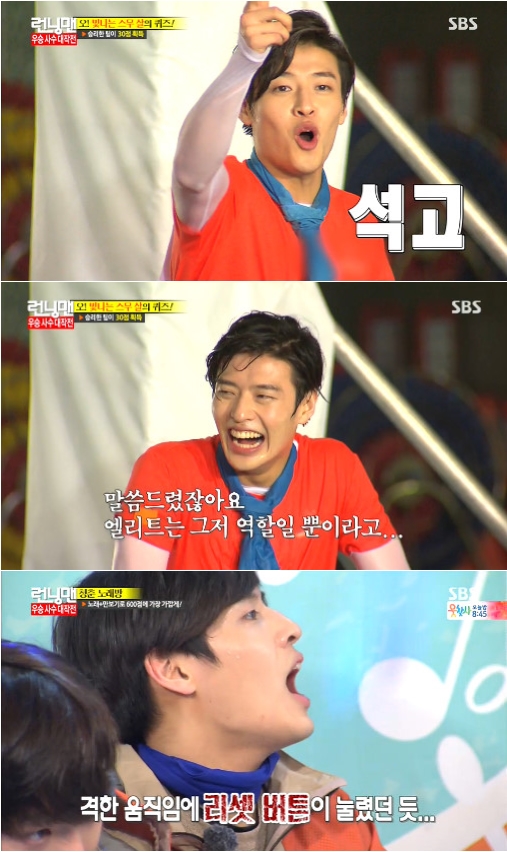 지난 29일 오후 방송된 SBS 예능프로그램 '일요일이 좋다-런닝맨'(이하 런닝맨)은 영화 '스물'의 주인공 김우빈, 이준호, 강하늘이 출연한 '스무 살 왕코를 지켜라' 편으로 꾸며졌다. 이날 멤버들은 힘을 모아 지석진의 우승을 도왔다. 지석진이 총 100점을 받아 단독 우승을 하면 결과적으로 멤버 전원이 우승을 하는 규칙 때문이었다. 덕분에 지석진은 최종 우승을 거머쥐었지만, 멤버들을 배신하고 부상인 금 10돈을 독식했다.