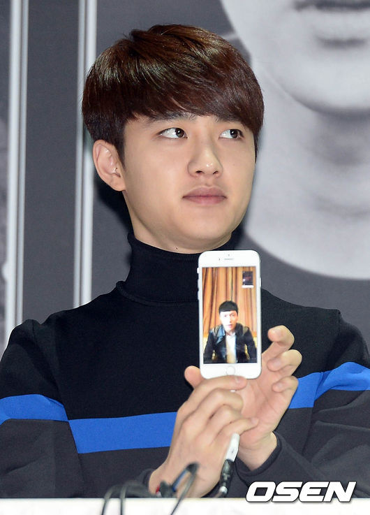 엑소 디오가 30일 오전 서울 삼성동 코엑스 SM타운에서 열린 컴백 기자회견에서 중국에 있는 레이와 화상 통화를 하고 있다.