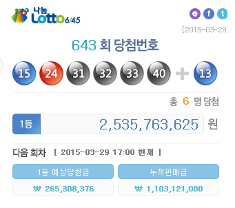 지난 28일 나눔로또가 추첨한 제643회 로또복권 1등 당첨번호는 '15, 24, 31, 32 ,33, 40'등 6개이다. 2등 보너스 번호는 '13'이다.