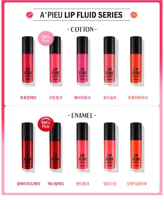 어퓨 립 플루이드는 광택감이 뛰어난 ‘에나멜 립 플루이드’와 벨벳 텍스처로 보송보송한 느낌의 ‘코튼 립 플루이드’ 등 두 가지 제형으로 나왔다. 레드, 체리, 핑크, 코랄, 오렌지 등 각각 다섯 가지 컬러 중에 선택할 수 있다.