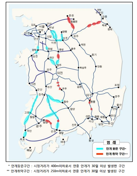 또한, 전국의 안개잦은 도로는 329개소 1573㎞로서 안개에 대한 도로별, 기관별 체계적인 안전관리 대책마련이 시급한 실정이다.