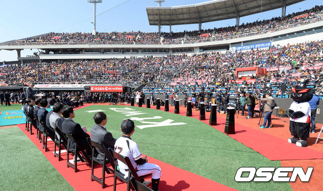 그라운드에서는 개막 오프닝 영상 상영을 시작으로 육군 51사단의 군악대 연주와 K-Tigers와 빅또리의 태권도 공연을 하고, kt wiz의 개막을 알리는 대형 통천 퍼포먼스를 한다.
