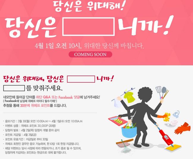 여기서 끝이 아니다. 기획전 오픈을 앞두고 현재 티저 이벤트를 진행 중이다. 4월 1일까지 빈칸에 들어갈 단어를 해당 기획전 페이지 내의 Q&A 게시판 또는 페이스북(Facebook)에 댓글로 남기면 추첨을 통해 20명에게 3만 위메프 포인트를 제공한다.