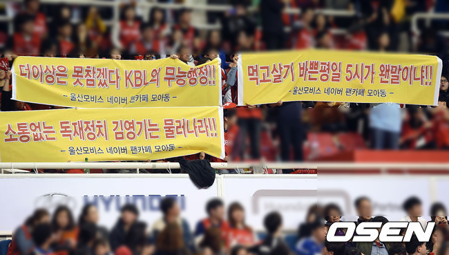 반발한 팬들은 1차전 두 차례에 걸쳐 기습적으로 플래카드를 걸고 시위를 했다. 걸개에는 ‘더 이상은 못 참겠다 KBL의 무능행정’, ‘먹고 살기 바쁜 평일 5시가 왠말이냐’, ‘소통 없는 독재정치 김영기는 물러나라’는 문구가 써져 있었다. 기습시위를 벌인 팬들은 시즌권을 갖고 있는 울산의 골수팬들이었다.