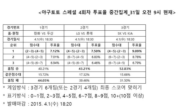 국민체육진흥공단(www.kspo.or.kr)이 발행하는 체육진흥투표권 공식 온라인 발매 사이트 베트맨(www.betman.co.kr)이 4월 1일(수)에 열리는 2015시즌 한국프로야구(KBO) 3경기를 대상으로 한 야구토토 스페셜 4회차 투표율을 중간 집계한 결과, 참가자의 43.21%는 LG-롯데(2경기)전에서 LG가 롯데에 승리할 것이라 예상했다.