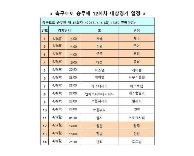 국민체육진흥공단(www.kspo.or.kr)이 발행하는 체육진흥투표권 수탁사업자인 스포츠토토(www.sportstoto.co.kr)는 오는 4일(토)부터 5일(일)까지 벌어지는 K리그 클래식 6경기 및 잉글랜드 프리미어리그(EPL) 8경기 등 총 14경기를 대상으로 한 축구토토 승무패 12회차 게임을 발행한다고 밝혔다.