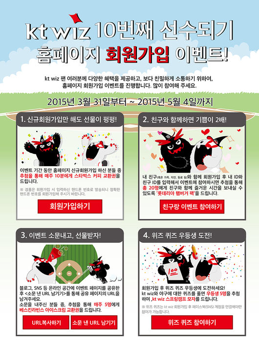 이와 함께 ‘kt wiz 10번째 선수가 되자’라는 주제로 진행되는 회원 가입 이벤트도 5월4일(월)까지 진행된다.