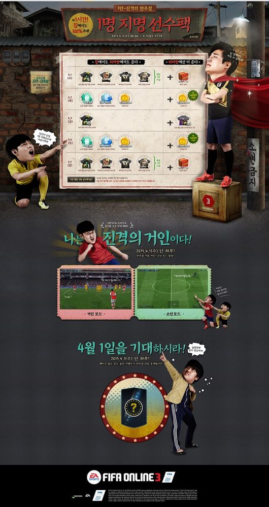 피파 온라인 3 서비스를 총괄하는 넥슨 이정헌 본부장은 “피파 온라인 3에서는 매해 만우절의 웃음을 책임지기 위해 기발한 시도를 해왔다”며, “올해는 희소성 높은 선수를 획득할 수 있는 기회도 주어지는 만큼 많은 관심을 부탁 드린다”고 말했다.