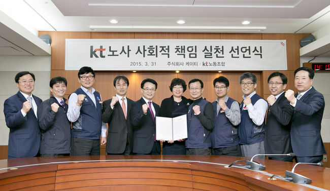 KT와 KT노동조합은 31일 KT 분당사옥에서 노사대표 각 5인과 성남지청장 및 관련자가 참석한 가운데 “노사의 사회적 책임 실천을 위한 공동선언”을 채택했다고 이날 밝혔다.