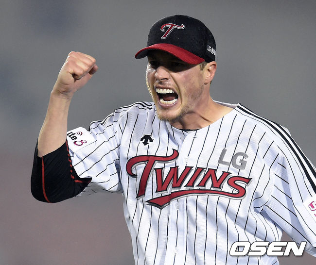 31일 오후 서울 잠실구장에서 열린 '2015 타이어뱅크 KBO 리그' LG 트윈스와 롯데 자이언츠의 경기,LG 선발 루카스가 2회초 위기상황을 넘기면서 공수교대때 환호하며 덕아웃을 향하고 있다.