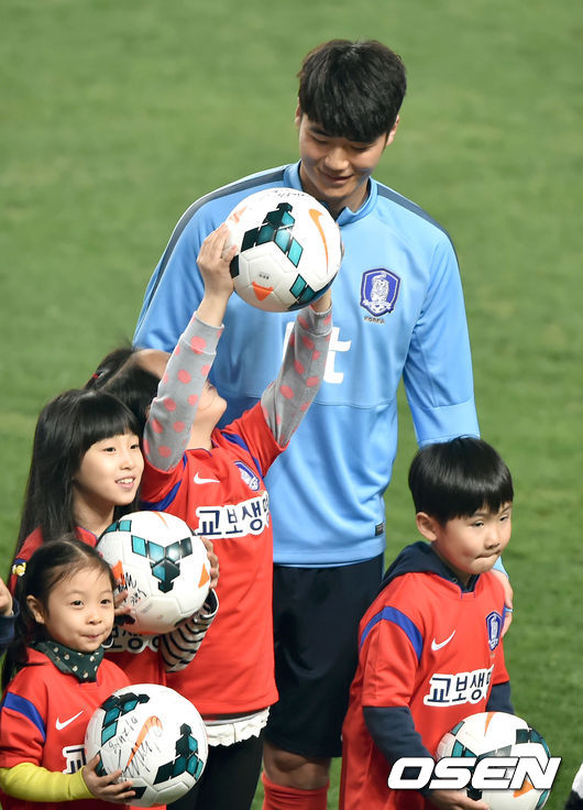 31일 오후 서울월드컵경기장에서 열린 한국과 뉴질랜드의 평가전에 앞선 식전행사에서 기성용이 어린아이를 흐믓한 미소로 바라보고 있다.