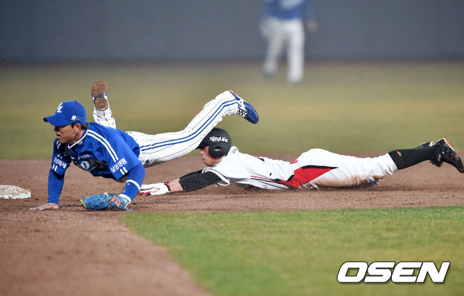 31일 오후 수원케이티위즈파크 열린 '2015 타이어뱅크 KBO 리그' kt와 삼성의 경기 2회말 2사 1루 주자 kt 김사연이 2루 도루에 성공하고 있다.