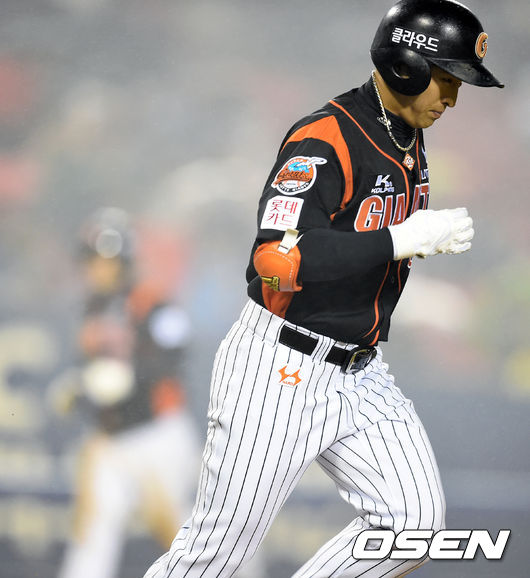 31일 오후 서울 잠실구장에서 열린 '2015 타이어뱅크 KBO 리그' LG 트윈스와 롯데 자이언츠의 경기,5회초 2사 만루 손아섭 밀어내기 볼넷으로 진루하며 3루주자 홈인 선취득점을 올리고 있다.
