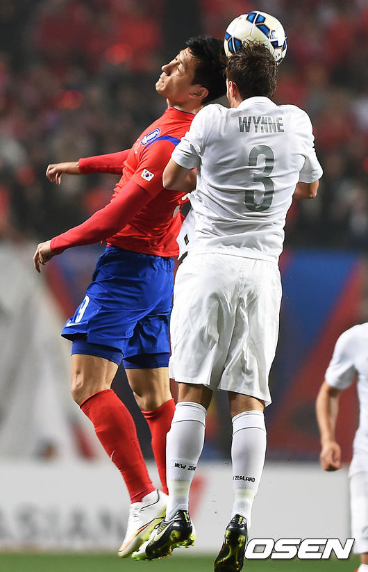31일 오후 서울월드컵경기장에서 열린 한국과 뉴질랜드의 평가전, 전반전 대한민국 지동원과 뉴질랜드 윈이 헤딩경합을 벌이고 있다.