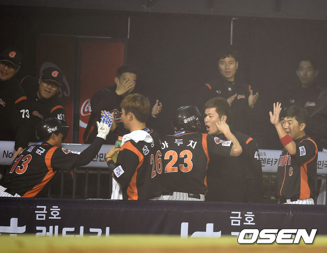 31일 오후 서울 잠실구장에서 열린 '2015 타이어뱅크 KBO 리그' LG 트윈스와 롯데 자이언츠의 경기,5회초 2사 만루 최준석의 2타점 적시타때 황재균,아두치가 득점을 올리며 덕아웃 동료의 축하를 받고 있다.