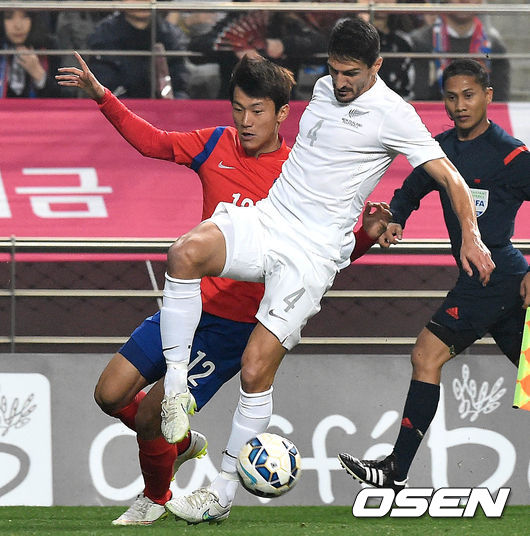 31일 오후 서울월드컵경기장에서 열린 한국과 뉴질랜드의 평가전 전반 한교원이 볼다툼을 하고 있다.