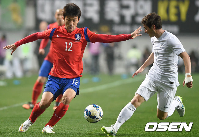31일 오후 서울월드컵경기장에서 열린 한국과 뉴질랜드의 평가전,전반전 대한민국 한교원이 뉴질랜드 로하스를 피해 드리블 시도하고 있다.