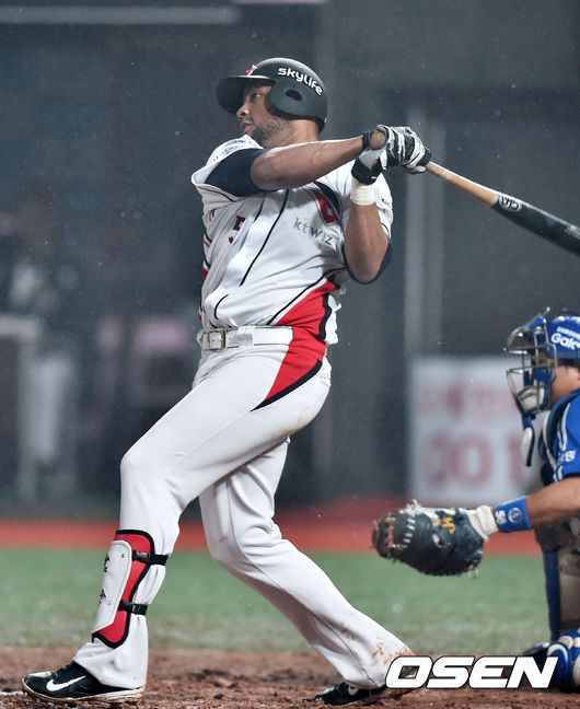 31일 오후 수원케이티위즈파크 열린 '2015 타이어뱅크 KBO 리그' kt와 삼성의 경기 4회말 2사 주자 만루 kt 마르테가 주자 싹쓸이 안타를 날리고 있다.