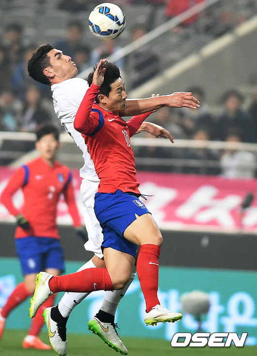 31일 오후 서울월드컵경기장에서 열린 한국과 뉴질랜드의 평가전, 전반전 대한민국 남태희가 뉴질랜드 복솔과 헤딩경합을 벌이고 있다.