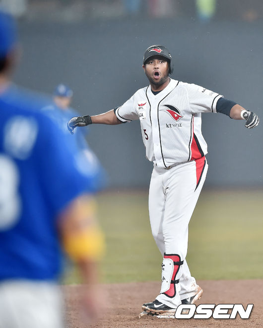 31일 오후 수원케이티위즈파크 열린 '2015 타이어뱅크 KBO 리그' kt와 삼성의 경기 4회말 2사 주자 만루 kt 마르테가 주자 싹쓸이 안타를 날린 후 2루에서 기뻐하고 있다.