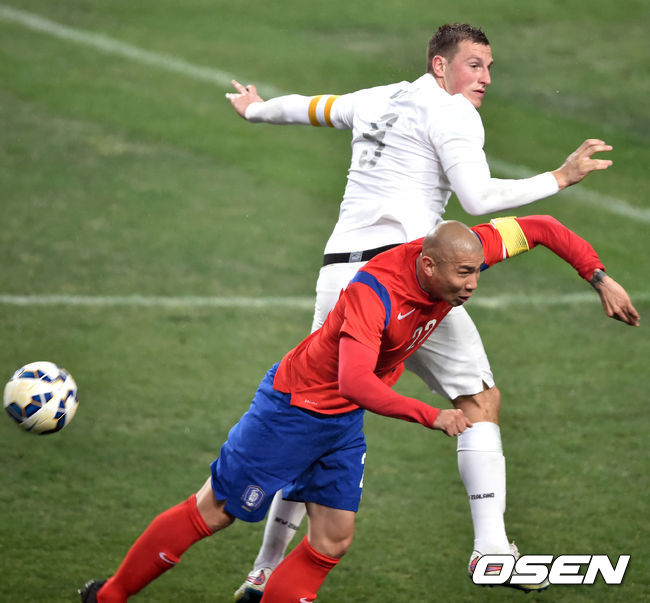 31일 오후 서울월드컵경기장에서 열린 한국과 뉴질랜드의 평가전, 전반 차두리가 헤딩볼 경합을 하다 쓰러지고 있다.
