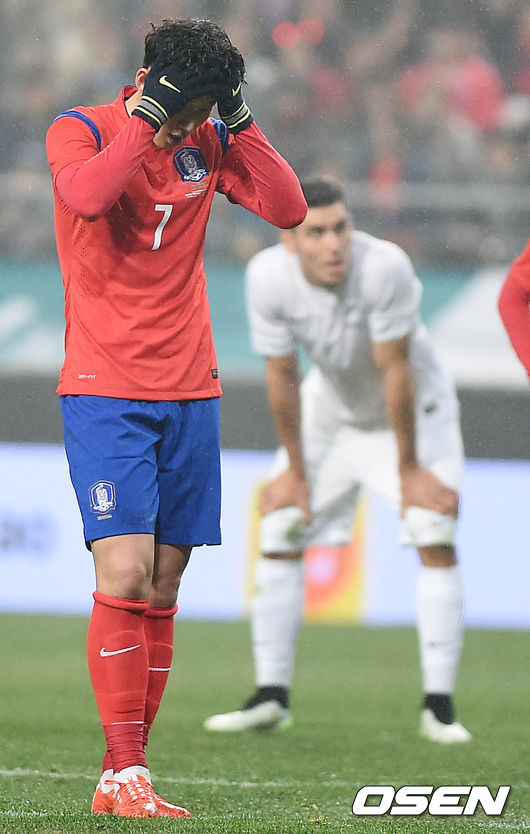 31일 오후 서울월드컵경기장에서 열린 한국과 뉴질랜드의 평가전, 전반전 대한민국 손흥민이 패널티킥을 실패하고 아쉬워하고 있다.