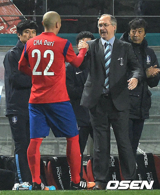 31일 오후 서울월드컵경기장에서 열린 한국과 뉴질랜드의 평가전 전반 차두리가 교체되어 나가 슈틸리케 감독과 하이파이브를 하고 있다.