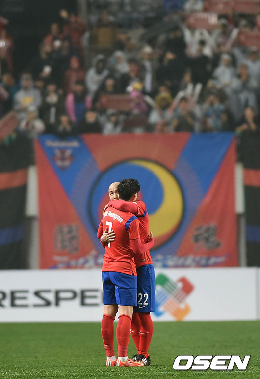 31일 오후 서울월드컵경기장에서 열린 한국과 뉴질랜드의 평가전, 전반전 대한민국 차두리가 교체되며 손흥민과 포옹을 나누고 있다.