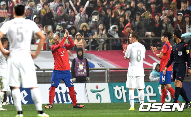 31일 오후 서울월드컵경기장에서 열린 한국과 뉴질랜드의 평가전 전반, 차두리가 교체되어 나가면서 박수를 치고 있다.