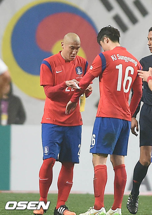 31일 오후 서울월드컵경기장에서 열린 한국과 뉴질랜드의 평가전, 전반전 차두리가 교체되며 기성용에게 주장완장을 넘겨주고 있다.