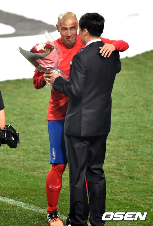 31일 오후 서울월드컵경기장에서 열린 한국과 뉴질랜드의 평가전, 전반 차두리가 은퇴식에서 아버지 차범근으로부터 꽃다발을 받고 있다.